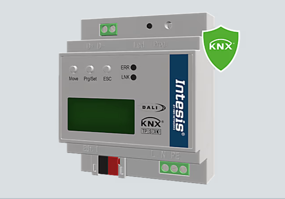 Gateway to integrate DALI/DALI-2 devices with KNX TP installations, exposing lighting drivers and sensor data to KNX using standard datapoints. Commissioning supported via Intesis MAPS/ETS depending on application.